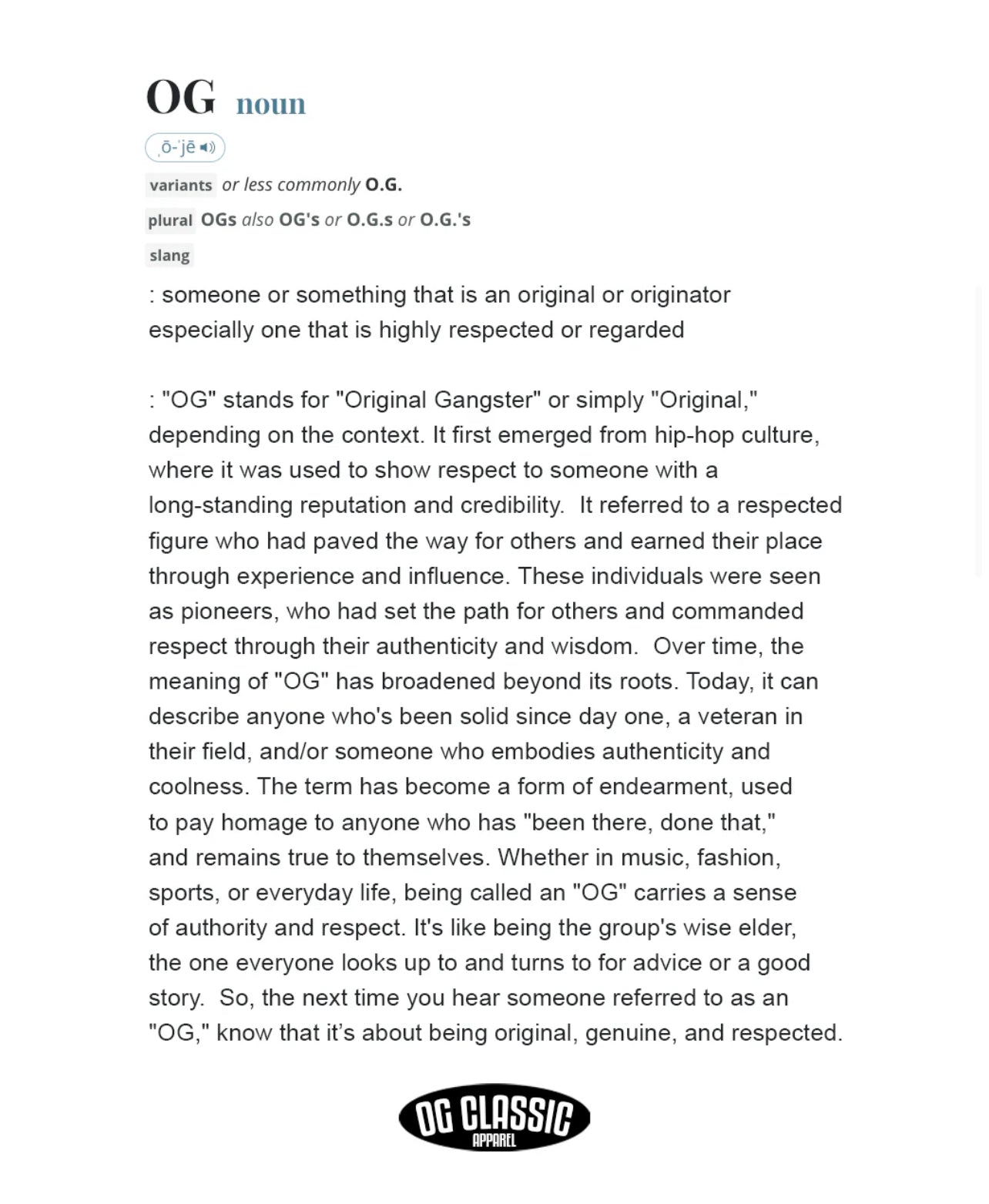 The utmost premium quality couture is the focal point of the OG Classic Apparel brand. Showcasing the intricacies of entertainment and culture through ageless designs paired with the highest quality fabrics to create timeless fashion is the platform that OG Classic Apparel was built upon. We stand on business and most certainly represent the culture to the absolute fullest. Much can be expressed with one short line of wisdom. The true essence of an OG.